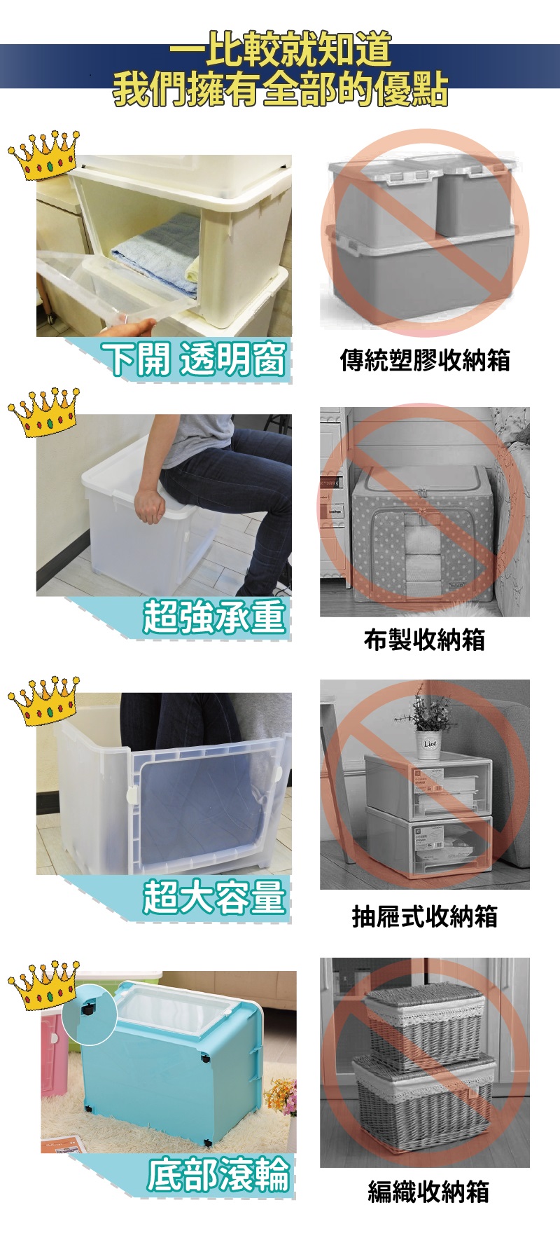 超大容量有別於市售常規尺寸的收納箱,無敵大滿足您所需的收納箱空間!底部滾輪設計,輕鬆好移動
